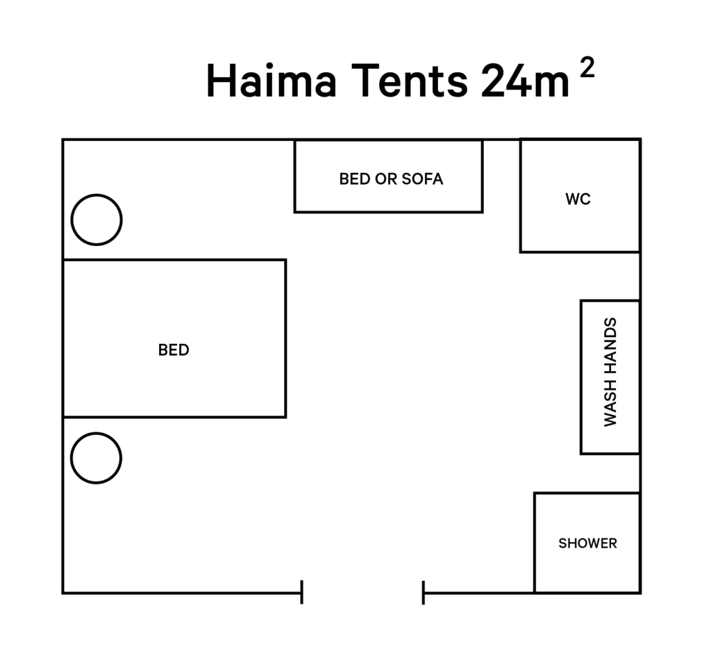 Tiendas (habitaciones) únicas en medio del desierto. Son haimas, tiendas típicas nómadas hechas de piel orgánica de dromedario y fabricadas a mano por artesanos locales. Cada haima tiene ducha con agua caliente, baño privado, artículos de aseo, toallas y ropa de cama.